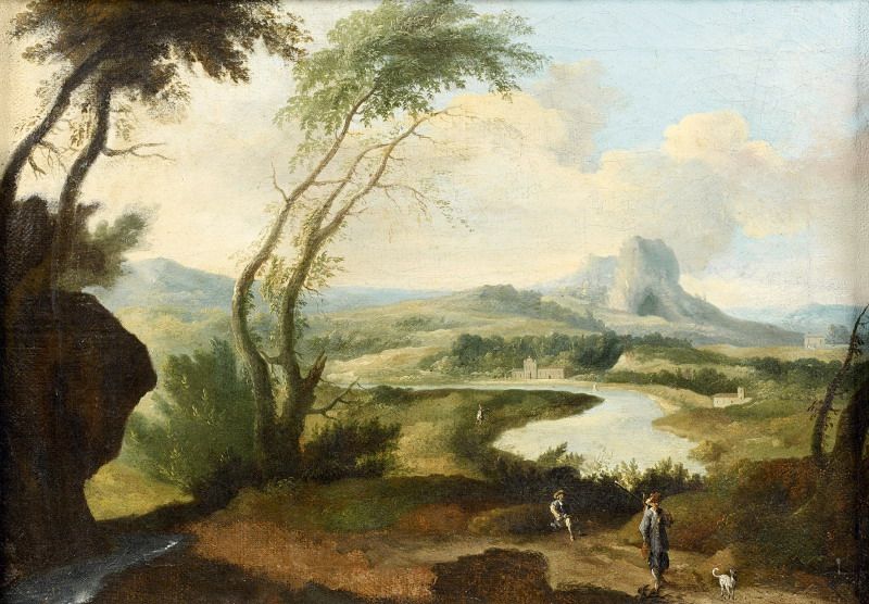 PAYSAGE FLUVIAL ANIMÉ, UN CHASSEUR ET SON CHIEN AU PREMIER PLAN