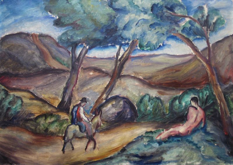 Sydländskt landskap med liggande man betraktandes man på åsna