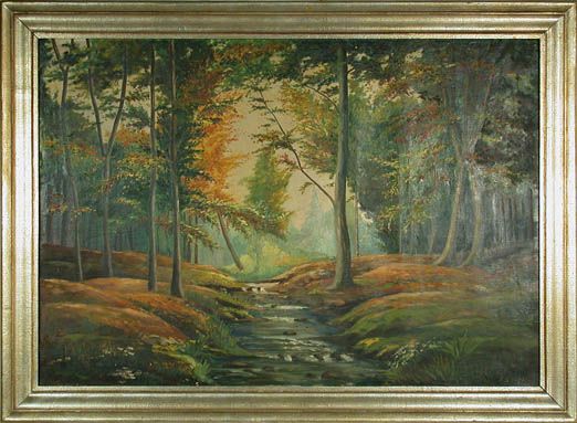 | Herbstliche Waldlandschaft. Durch den Laubwald mit herbstlich verfärbten Bäumen zieht sich ein kleiner Bachlauf | |