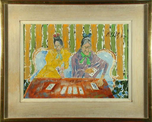 Humoristische Darstellung zweier alter Damen auf einem Sofa beim Patiencelegen