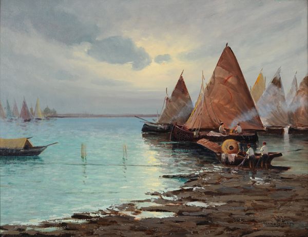 Laguna con imbarcazioni sullo sfondo di Venezia