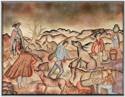figures in mountain landscape with dogs and rabbits