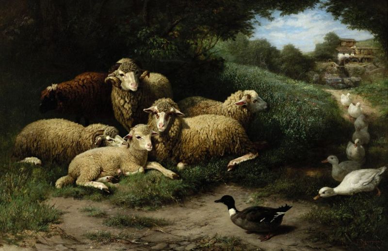 | Schafe und Entenschar am Waldrand, im Hintergrund eine Mühle am Bach | |