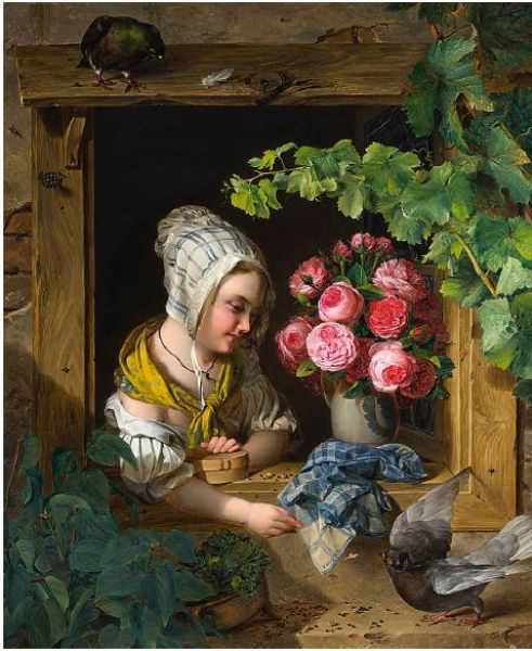 | Mädchen füttert an einem mit Wein umrankten Fensterbrett Tauben. Neben ihr ein Rosenstrauß in einer Vase. | |