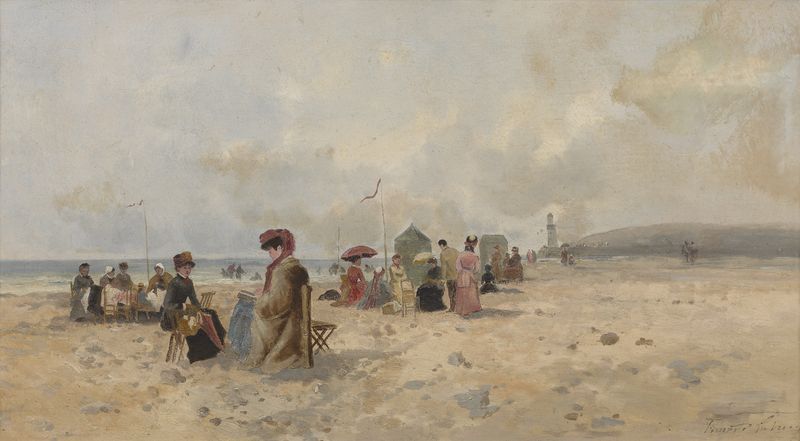GROUPE DE DAMES SUR UNE PLAGE NORMANDE.