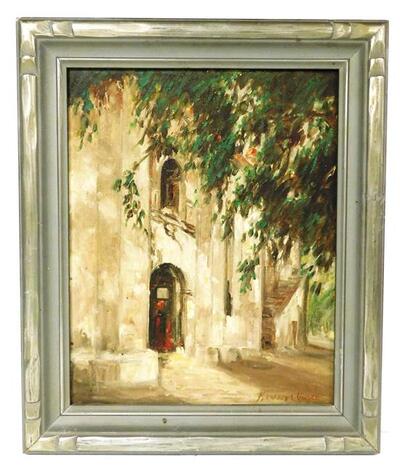 | Depicts stucco building with arched doorway all under leafy branches | |