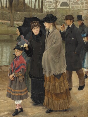 | Folk som gå fra kirke. En lille pige går foran to kvinder, af hvilke den ene har opslået paraply | |