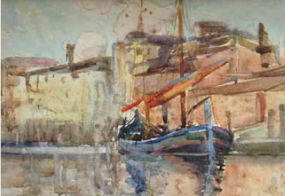 Harbour Scene (Cornwall) with Moored Boat and Buildings
