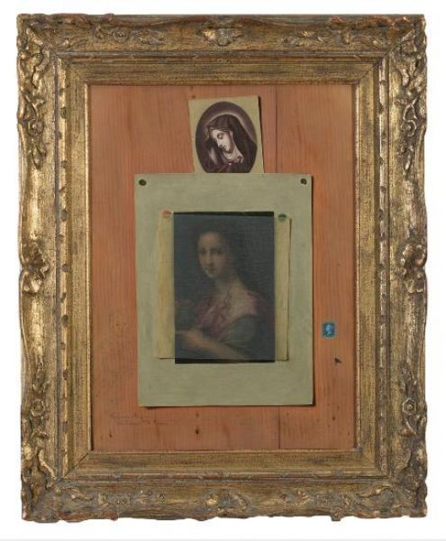 | TROMPE L'OEIL OF A WOMAN'S PORTRAIT COVERED WITH TRACING PAPER TACKED TO A WALL, AN IMAGE OF THE MADONNA TUCKED ABOVE | |