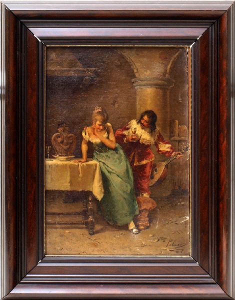 | Interieurszene in einem prächtigen Saal. Im Vordergrund ein Mandolinenspieler in mittelalterlicher Tracht, einem verschämt zu Bo | |