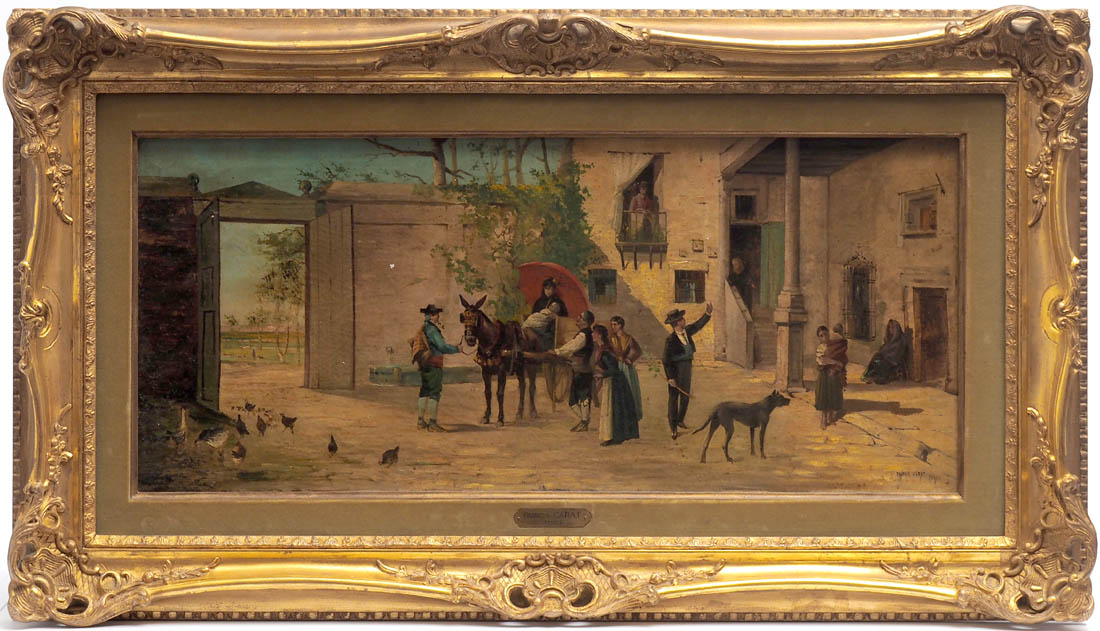 Farewell to a young bride and groom in the courtyard of a rich Spanish homestead with numerous figurines
