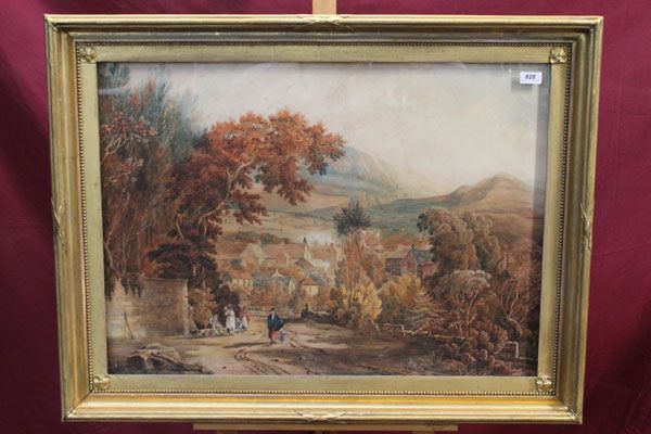 figures on a road leading to a village with hills beyond