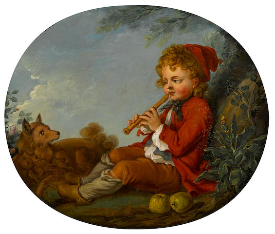 A young girl with flowers and sheep; A young boy with flute and dog (a pair)