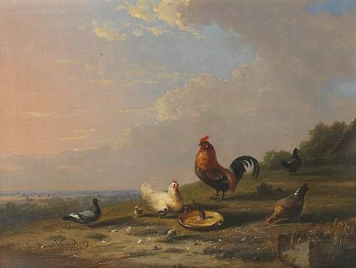 Chickens and a pigeon in a landscape