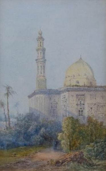 Eastern landscape scene with figures on a path by a mosque