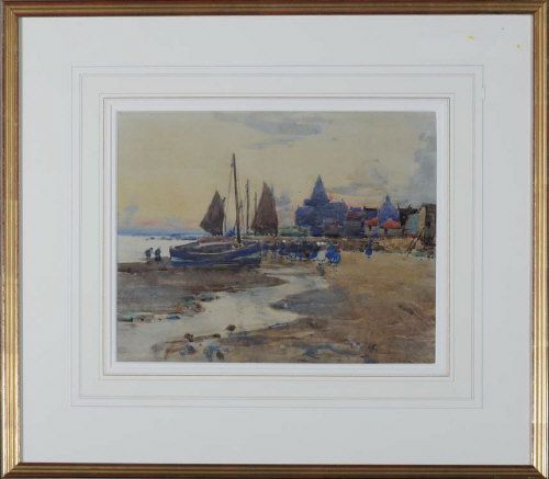 A BEACH SCENE WITH FISHERFOLK AND BOATS