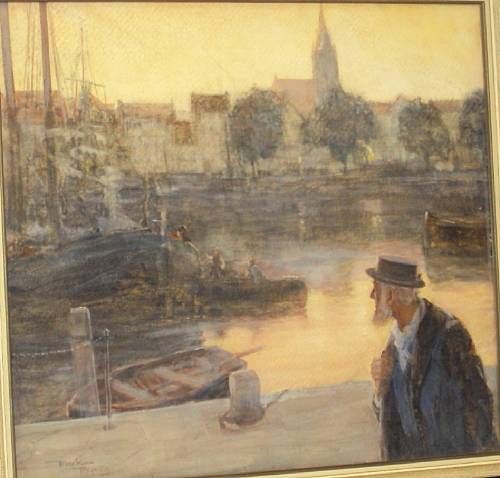 Harbour scene with fishermen at dusk