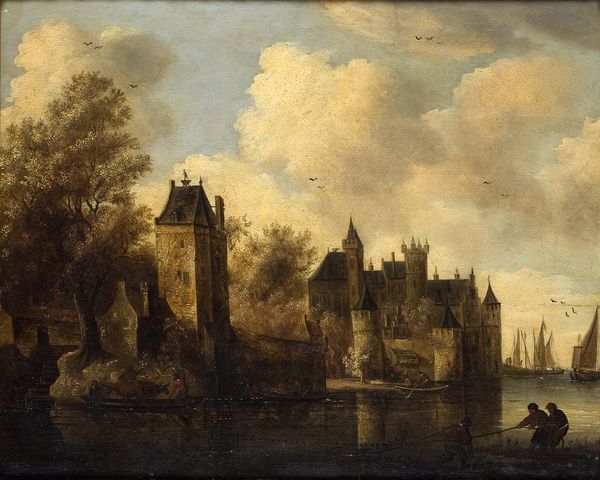 | VILLE FORTIFIEE EN BORD DE FLEUVE, ANIMEE DE PERSONNAGES | |