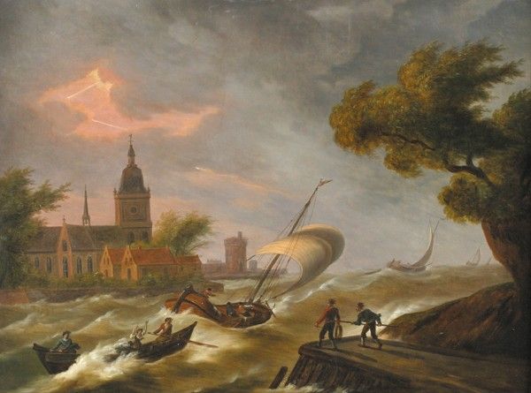 Havengezicht met uitvarende schepen bij stormachtig