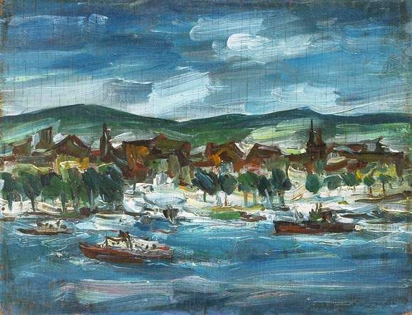 Flusslandschaft mit Booten vor angrenzender Stadt