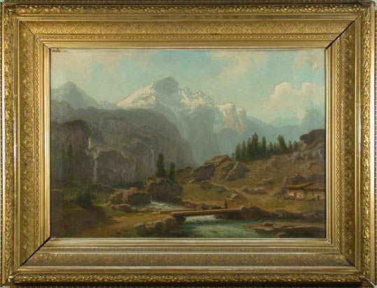 Weites, von einem Gebirgsbach durchflossenes Hochtal, am Ufer zwei Almhütten