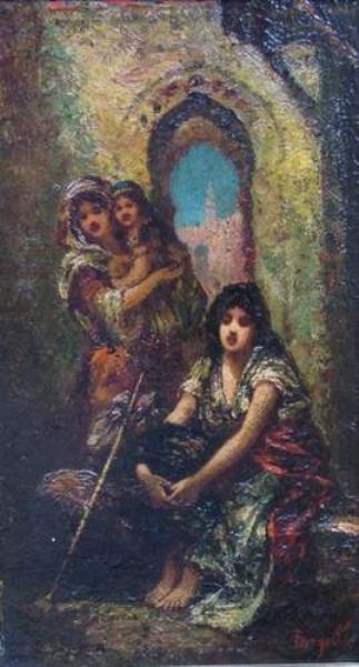 Vor den Toren einer Stadt zwei rastende Orientalinnen mit Kind.