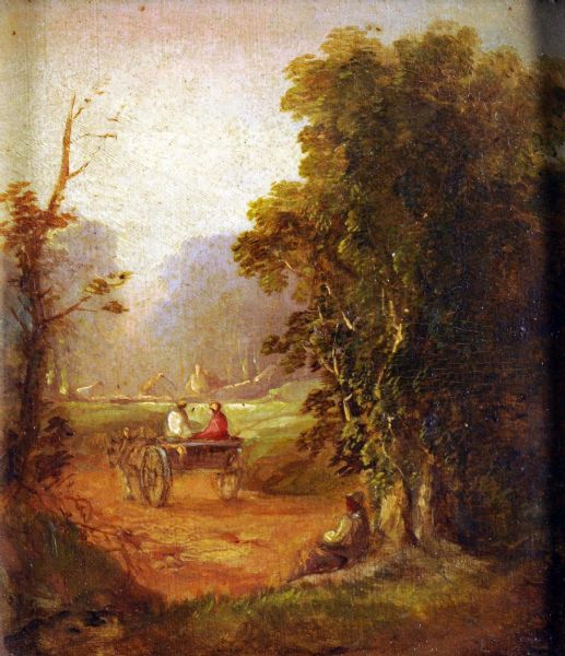 | showing figure resting beneath a tree, watching two figures in horsedrawn cart | |