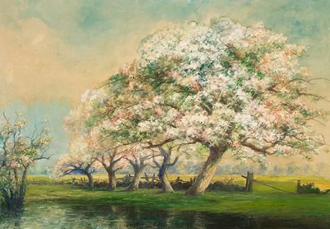Landscape with blossoming apple trees along a fence