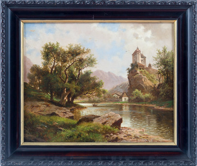 | Austrian hilly landscape with a river and a monastery situated on a high cliff | |