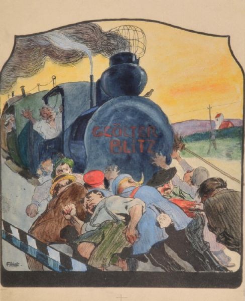 Viele Leute stemmen sich einer Dampflokomotive entgegen