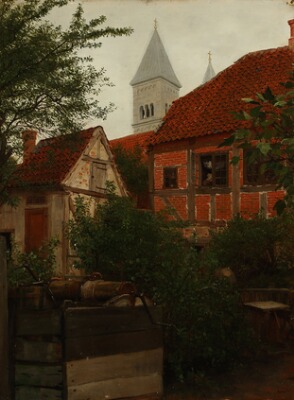| From a back yard with the towers of Viborg Cathedral in the distance | |