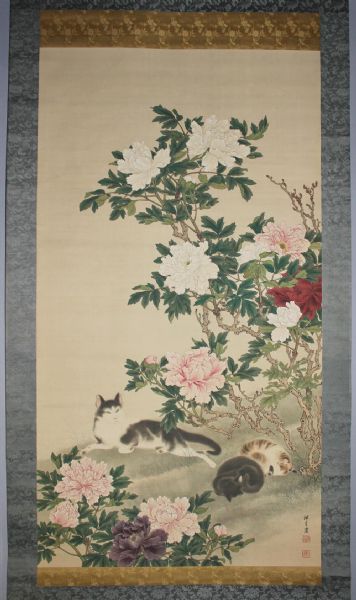 | MOTHER CAT GUARDING KITTENS AMONG FLOWERING PEONIES | |