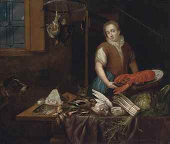 | A maid in a kitchen interior, a lobster on a platter, dead birds, fish, asparagus, a dog and a cat | |