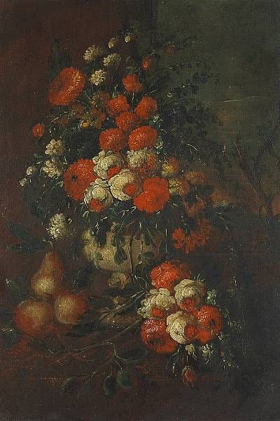 A still life with fruit and flowers in a vase on a ledge with a landscape beyond