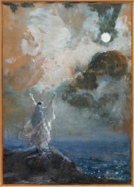 Two white-clad figures on a cliff above the sea, the full moon worshiping.