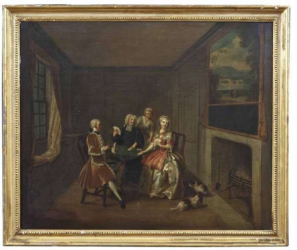 | A Game of Cards, in an early Georgian interior, with a maid-servant pouring a glass of wine, a cat and dog by the fire | |