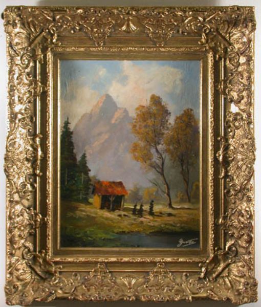 | Sommerliche Partie in den Alpen. Im Vordergrund ein kleiner Stall am Ufer eines Sees | |