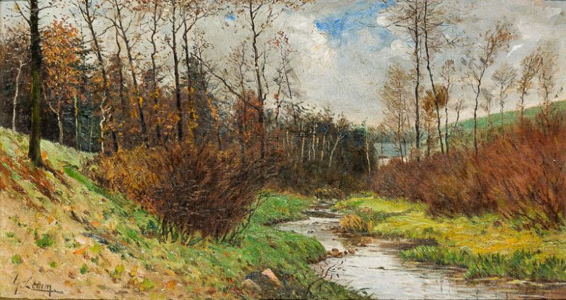 Spätherbst. Bewaldete Landschaft mit Sträuchern und Bachlauf