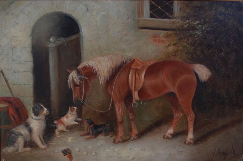 | A saddled horse outside a stable with attendant dogs | |