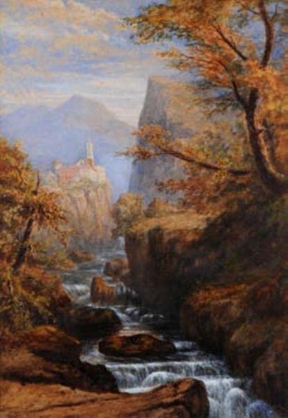 | An Italianate upland river scene, a monastery on a hilltop, mountains beyond | |