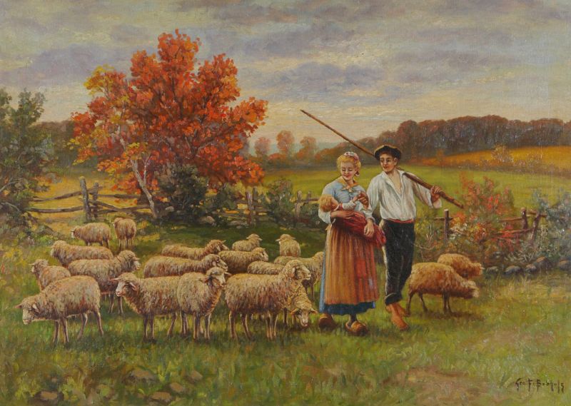 Landscape with Flock of Sheep, Shepherd, & His Family