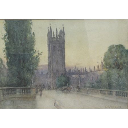 | An Oxford street scene with figures and a horse and cart on Magdalen Bridge, Magdalen College in the distance | |
