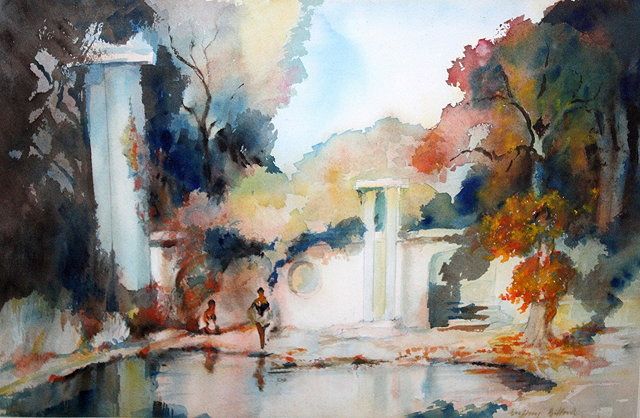 A continental landscape with two female figures beside a pool in a walled garden