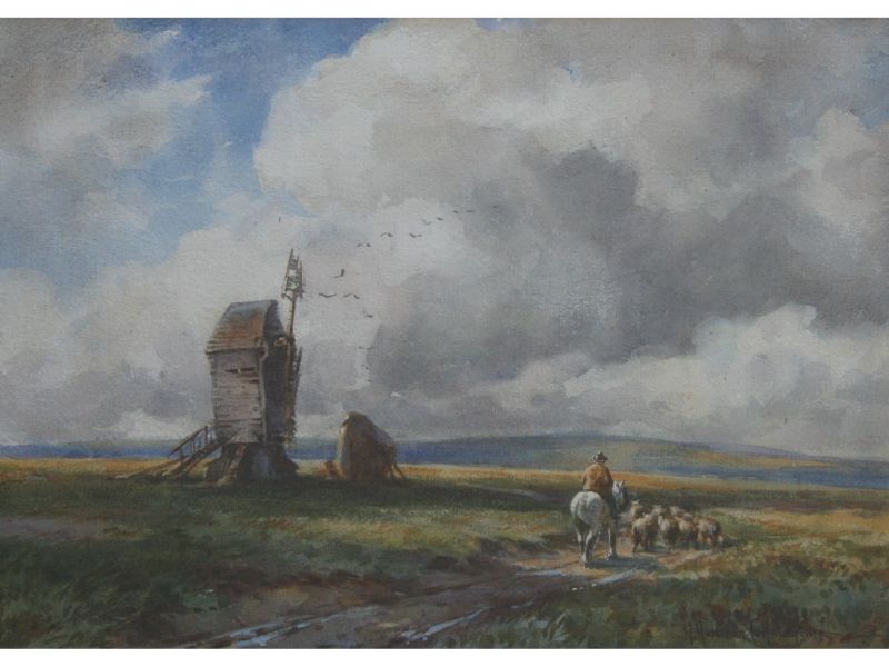 DROVING SHEEP ON A MOORLAND PATH, NEAR A WINDMILL