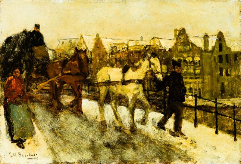 | Pferdefuhrwerk mit Kutscher und den Schimmel führendem Knecht über verschneiter Gracht | |