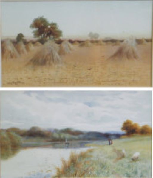 Sheep on a river bank and harvest time.