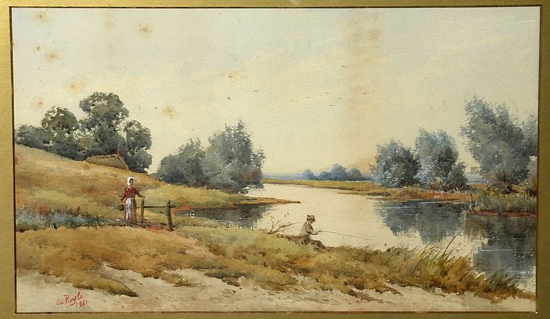 fishermen on a river bank with a lady on a pathway carrying a basket