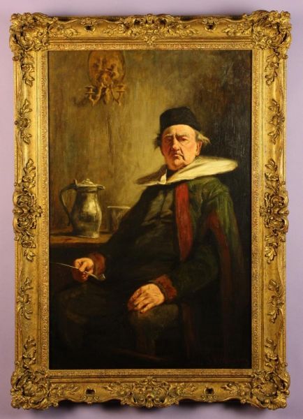 | Interior Scene with Elderly Toper wearing a fez hat and broad starched white collar, sat at a table with pewter flagon, pipe in | |
