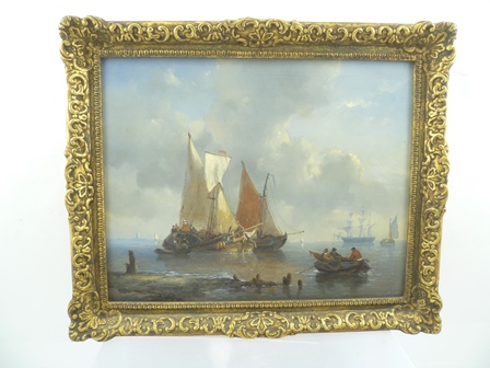 | Marine Activity, sailing barges moored off the coast, in the foreground figures and row boats, with a three-masted ship at ancho | |