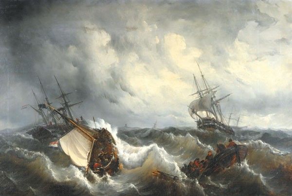 | Schepen op stormachtige zee, op de voorgrond enkele sloepen met matrozen | |